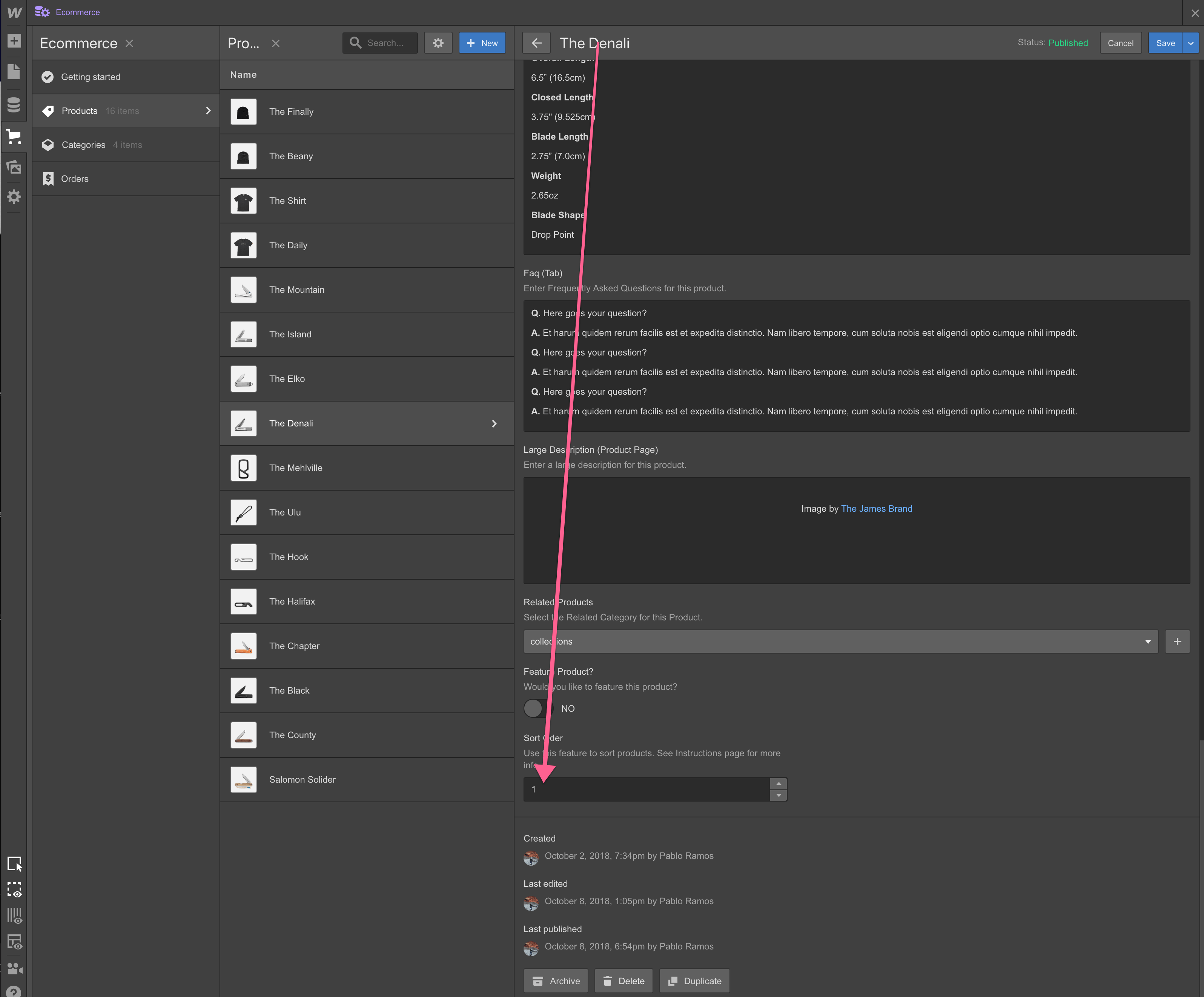 2. Next, on the filter settings of your product showcase, select the Sort order number for your product. In this case the number one. Do the same for the rest of products.